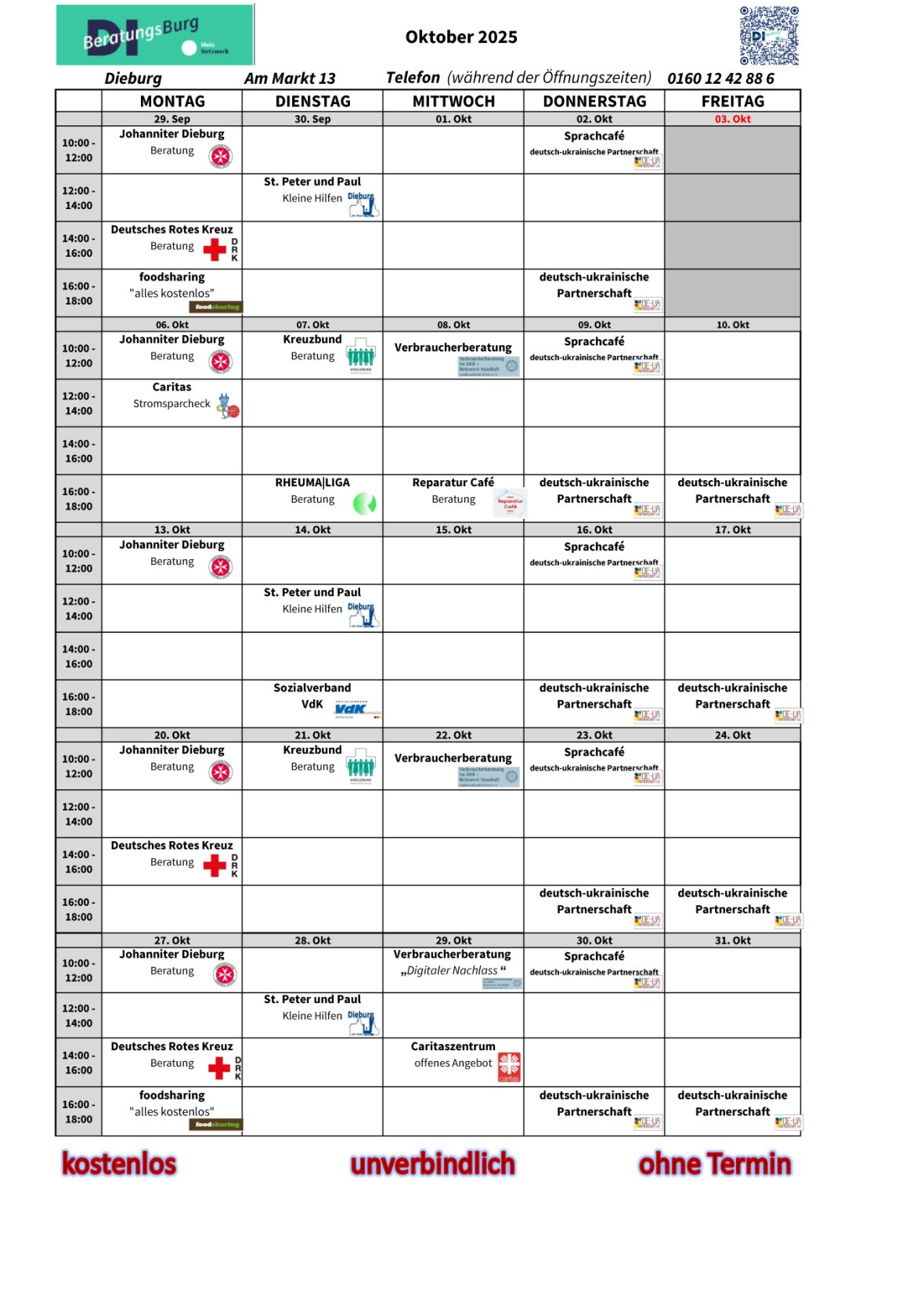„DI BeratungsBurg“ befindet sich direkt gegenüber der Sparkasse (Markt 13) und besteht aus zwei Räumen, in denen dann folgende Initiativen und Organisationen zu finden sind: Verbraucherberatung, Johanniter, Caritas (mit verschiedenen Angeboten), Deutsches Rotes Kreuz (mit verschiedenen Angeboten), Solarinitiative Dieburg, Seniorenbeirat, Tauschring, Reparatur-Café, „Foodsharing“, Caritaskreis St. Peter und Paul und der Deutsch-Ukrainische Partnerschaftsverein. Zu festen Zeiten werden diese wöchentlich sowie ein- oder zweimal im Monat dort für Beratungen zur Verfügung stehen – und weitere Initiativen, die in das Rahmenprogramm passen, können sich gerne anschließen!