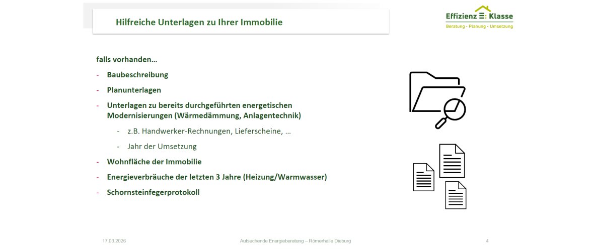 Bereits im Herbst 2024 zeigte sich: Das Interesse ist riesig! Innerhalb weniger Wochen waren alle 100 kostenfreien Beratungsplätze vergeben. Viele Dieburgerinnen und Dieburger haben den ersten Schritt Richtung persönliche Energiewende gemacht – ein starkes Signal für unsere Stadt.