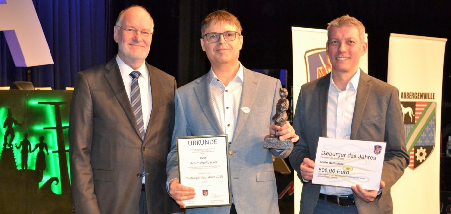 Eine besondere Ehrung wurde Achim Weißbäcker auf dem Neujahrsempfang der Stadt Dieburg zuteil: Stadtverordnetenvorsteher Dr. Harald Schöning und Bürgermeister Frank Haus zeichneten den Vorsitzenden des Verschwisterungskomitees Dieburg–Aubergenville als „Dieburger des Jahres 2025“ aus. Gewürdigt wurde damit sein langjähriges und herausragendes Engagement für Vielfalt, Verständigung und gelebte Begegnung über Ländergrenzen hinweg. Achim Weißbäcker ist zugleich der erste Preisträger, dem die neu gestaltete Statuette aus dem Atelier von Martin Konietschke überreicht wurde. Die Auszeichnung zeigt ab diesem Jahr eine weibliche Figur und setzt damit auch gestalterisch ein neues Zeichen.