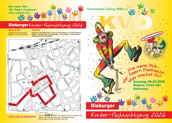 Kinderfastnachtszug: Am Sonntag, 8. Februar, ist die Dieburger Innenstadt in der Zeit von 14.30 bis 16 Uhr teilweise gesperrt. Die Aufstellung des Kinderfastnachtszuges erfolgt im Steinweg. Von dort führt der Zug über die Rheingaustraße, Hinter der Schießmauer, die Konrad-Adenauer-Straße, die Goethestraße sowie die Kolpingstraße durch die Straße „In der Altstadt“, weiter in die Zuckerstraße bis auf den Marktplatz, wo der Zug sich auflöst.