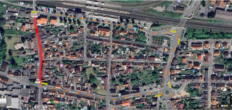 Die Umleitung erfolgt über die Frankfurter Straße und „Am Minnefeld“, Hinweisschilder auf die Straßensperrung werden bereits ab der Bahnunterführung aufgestellt. Für den Busverkehr wird während dieser Zeit im Bereich des P&R-Platzes am Bahnhofsgebäude ein Wendeplatz eingerichtet, weshalb einige öffentliche Parkplätze wegfallen werden.