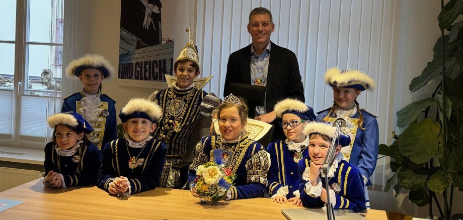 Mit einem dreifach-donnernden „Dibborsch Äla!“ hieß Frank Haus den aktuellen Kinder-Prinz Marten I. - Vum flinken Ball - Borsch der Natur mit Brunnebuzzer - Butz-Kultur (Marten Tüshaus) und seine Kinder-Prinzessin Anna I. - Schwimming Haifisch - Sport Aktörsche Mutter Gottes - Bleschohrn-Öhrche (Anna Fath) willkommen. Begleitet wurden die Nachwuchs-Tollitäten standesgemäß von ihren Pagen Niklas vom Snake Lake (Niklas Ebert), Jonathan van rund‘ de Gass (Jonathan Eicke), Marie von Blech mit Öhrche (Marie Fath) und Lina van Brunn de Butz (Lina Tüshaus) sowie von zwei Mitgliedern der Kinderprinzengarde.