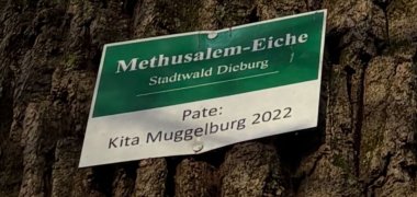 Besonders beeindruckende knorrige, alte Bäume werden vom Forstamt Dieburg als Methusalembäume ausgewählt. Wer eine Patenschaft übernehmen möchte, sucht sich gemeinsam mit den zuständigen Revierförstern „seinen“ Baum aus, der fortan die Namensplakette des Spenders am Stamm trägt und dauerhaften Schutz genießt. Im Dieburger Stadtwald beispielsweise hat unweit des Freizeitzentrums „Spießfeld“ die Kindertagesstätte „Muggelburg“ die Patenschaft für eine rund 150 Jahre alte Eiche übernommen.