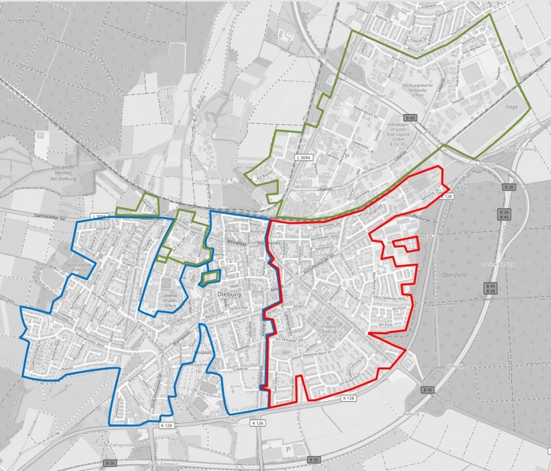 Deutsche Glasfaser, grün: NGA & Entega). Lageplan: Stadt Dieburg