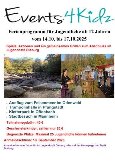 Die Kinder- und Jugendförderung der Stadt Dieburg lädt auch in den kommenden Herbstferien wieder zu einem spannenden Ferienprogramm für Jugendliche im Alter von 12 bis 16 Jahren ein. Vom 14. bis 17. Oktober 2025, jeweils von 11 bis 16 Uhr, erwartet die Teilnehmenden ein abwechslungsreiches Programm mit zahlreichen Ausflügen, Action und jeder Menge Spaß im Jugendcafé Dieburg.