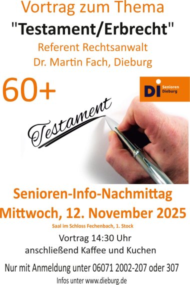 Der Seniorenbeirat Dieburg lädt zu einem Info-Nachmittag 60plus zum Thema „Testament und Erbrecht“ ein. Am Mittwoch, 12. November 2025, wird Rechtsanwalt Dr. Martin Fach aus Dieburg in seinem Vortrag erläutern, worauf es bei der Erstellung eines Testaments ankommt und welche rechtlichen Hintergründe es gibt. Der Vortrag findet ab 14.30 Uhr im Saal des Museums Schloss Fechenbach, Eulengasse 8, statt. Im Anschluss gibt es Kaffee und Kuchen.