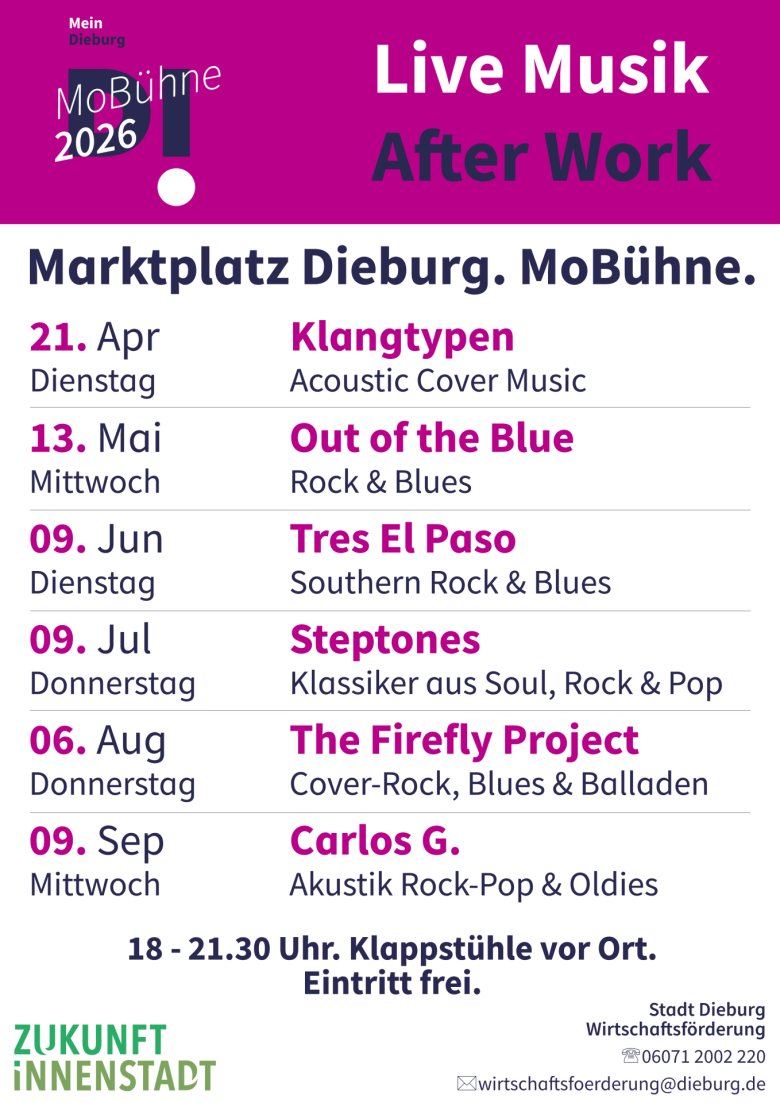 Am Mittwoch, 13. Mai, folgt „Out of the Blue“ – eine Band, die kraftvollen Blues und Rock zu einer energiegeladenen Mischung verbindet. Mit „Tres el Paso“ geht es am Dienstag, 9. Juni, auf eine musikalische Reise durch mehrere Jahrzehnte über den amerikanischen Kontinent bis über die mexikanische Grenze. Tanzbar wird es am Donnerstag, 9. Juli, wenn die „Steptones“ den Marktplatz mit Klassikern aus Soul, Rock und Pop zum Grooven bringen. Der Donnerstag, 6. August, gastiert die Band „The Firefly Project“ aus Wiesbaden, die Cover-Rock von gefühlvollen Balladen über fetzige Klassiker bis zu energiegeladenen Power-Songs präsentiert. Den Abschluss der MoBühne-Saison 2026 gestaltet schließlich am Mittwoch, 9. September, der Solokünstler „Carlos G.“ mit ausdrucksstarker Stimme und Akustikgitarre.