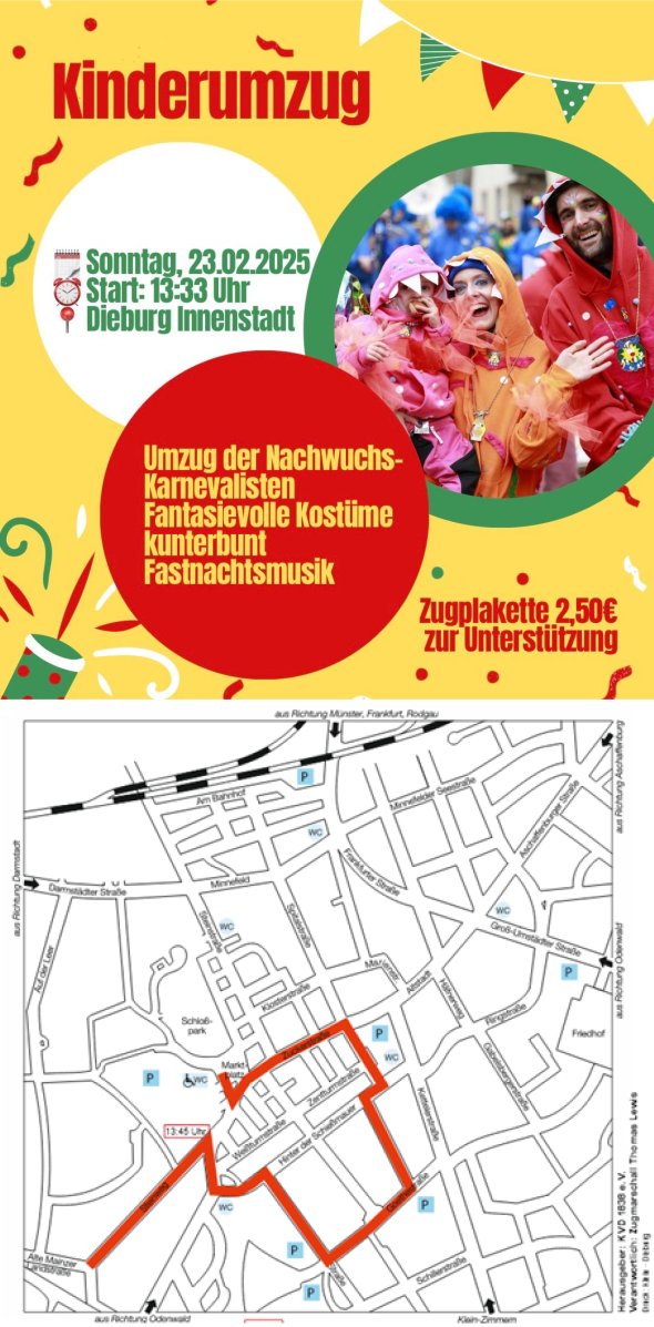 Am Sonntag, den 23. Februar 2025, übernehmen die kleinen Narren die Straßen von Dieburg! Der Kinderfastnachtszug startet um 13:33 Uhr und verspricht jede Menge Spaß, kreative Kostüme und strahlende Kinderaugen.